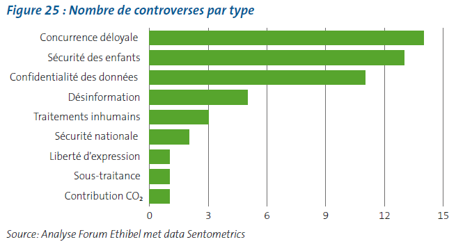 La plupart des controverses sont de nature sociale et concernent les droits de l’Homme, la confidentialité des données, la sécurité des enfants, les contenus préjudiciables, les discours de haine, les traitements inhumains, les mauvaises conditions de travail, la censure et la désinformation. Chez Alphabet uniquement, la majorité des controverses concernent la gouvernance d’entreprise. Il s’agit de concurrence déloyale (monopole), de vérification des faits (fact-checking) et de sécurité nationale. Seule une controverse environnementale a été recensée. Le graphique ci-dessous présente le nombre de controverses par type. La liste complète est disponible en annexe.