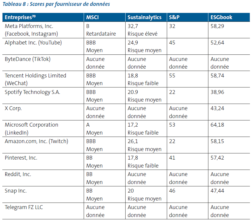 Il existe de nettes différences entre les scores des quatre fournisseurs de données. Ainsi, six entreprises sont cotées différemment par un des quatre fournisseurs. Meta obtient un score moyen de 58,29 de la part d’ESGbook, tandis que MSCI classe l’entreprise comme « retardataire », S&P comme « faible » et Sustainalytics comme « à haut risque ». Tencent obtient un score plus favorable, étiqueté « faible risque » de la part de Sustainalytics et un score supérieur à la moyenne de la part de S&P, mais un score plutôt moyen de la part des deux autres. Pinterest obtient un score très moyen de la part de MSCI, S&P et d’ESGbook, tandis qu’il obtient un bon score « faible risque» de la part de Sustainalytics. Amazon obtient un score faible de la part de S&P et un score moyen de la part des deux autres.
