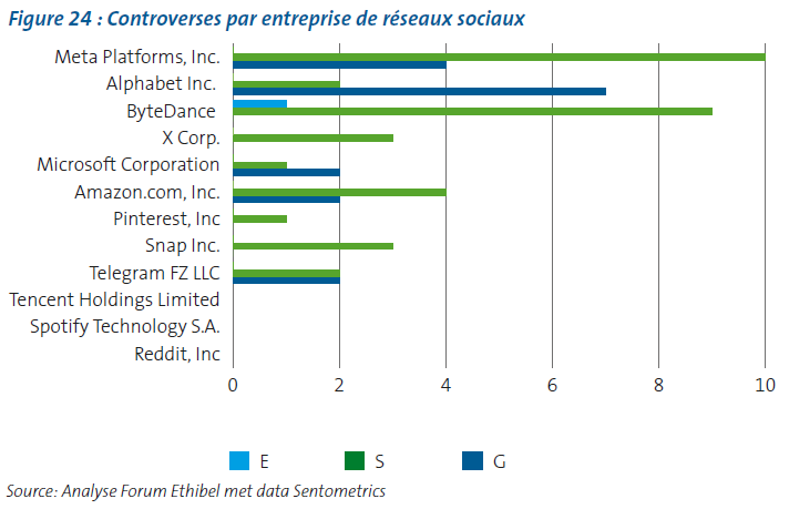 Comme le révélera l’analyse des controverses ci-dessous, les données de MSCI et S&P montrent que les principaux enjeux des entreprises de réseaux sociaux se situent au niveau social et, dans une moindre mesure, au niveau de la gouvernance. Seul Spotify fait exception.