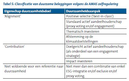 In de studie zijn volumes ook voor het eerst geclassificeerd volgens een methodologie ontwikkeld door Eurosif, de Universiteit van Hamburg, de Sustainable Finance Research Group en Advanced Impact Research (AIR). De methodologie dient in eerste instantie om marktstudies over duurzame investeringen op Europees niveau te standaardiseren, en niet als voorstel voor integratie in wettelijke kaders. Beleggingen met ESG-basiskenmerken moeten bindende exclusies of positieve screening hebben, ‘geavanceerde ESG beleggingen’ beide, én er is een 20% reductie van het beleggingsuniversum nodig. Voor ‘impact-gealigneerde beleggingen’ moeten investeringen gealigneerd zijn met een algemeen erkende positieve impact categorie die kan worden gemeten, terwijl voor ‘impact-genererende’ beleggingen aantoonbare impact nodig is, en een actief aandeelhouderschap van de investeerder45. In onderstaande tabel van Eurosif wordt duidelijk hoe de methodologie zowel de categorieën van de SFDR en de Britse Financial Conduct Authority (FCA – zie ook de uitleg over de SDR) in rekening neemt.